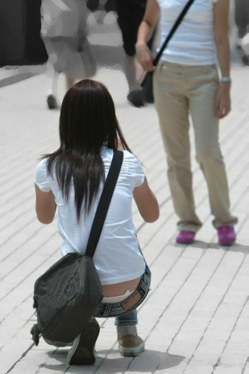 座るお姉さんのパンツがはみ出してるハミパン画像www