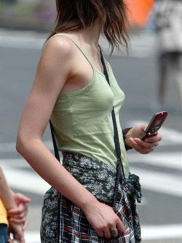 肩掛けカバンのベルトで強調されたおっぱい