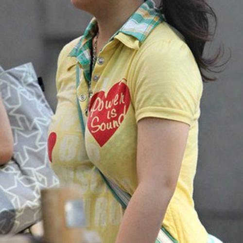 肩掛けカバンのベルトで強調されたおっぱい