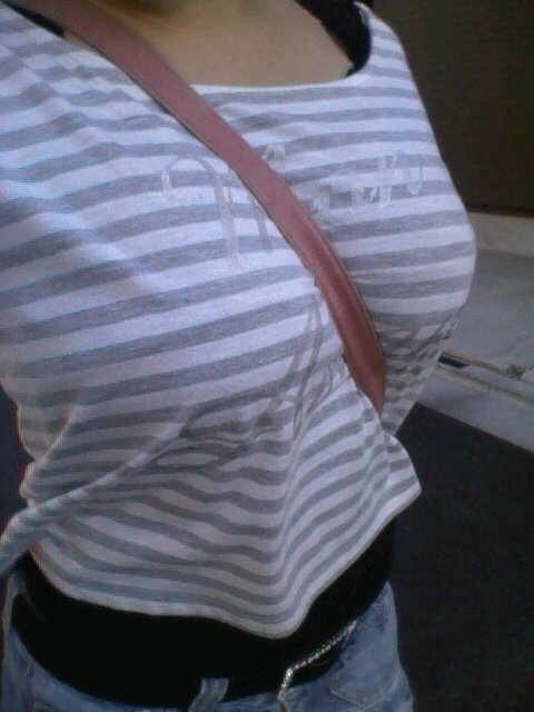 肩掛けカバンのベルトで強調されたおっぱい