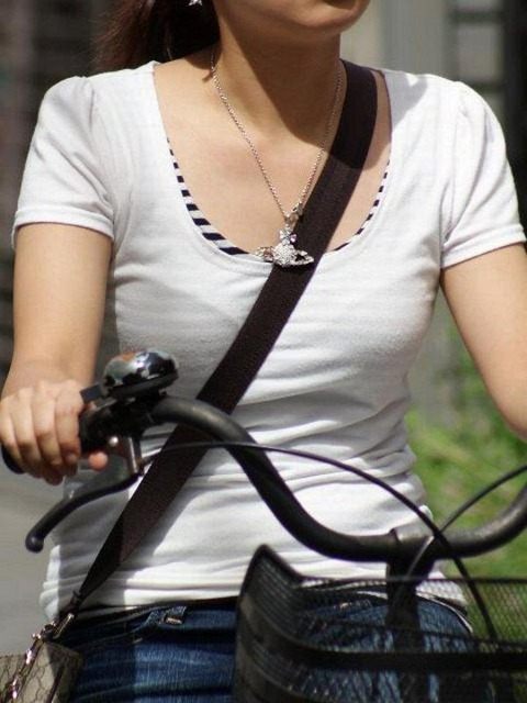 肩掛けカバンのベルトで強調されたおっぱい