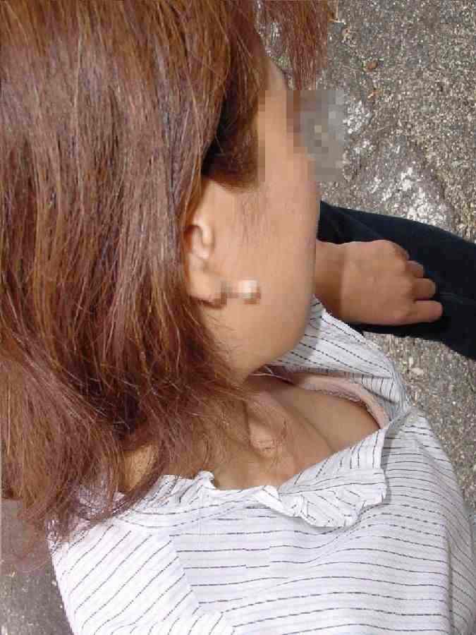 巨乳人妻さんの胸の谷間が丸見えで乳首も見えてるwww