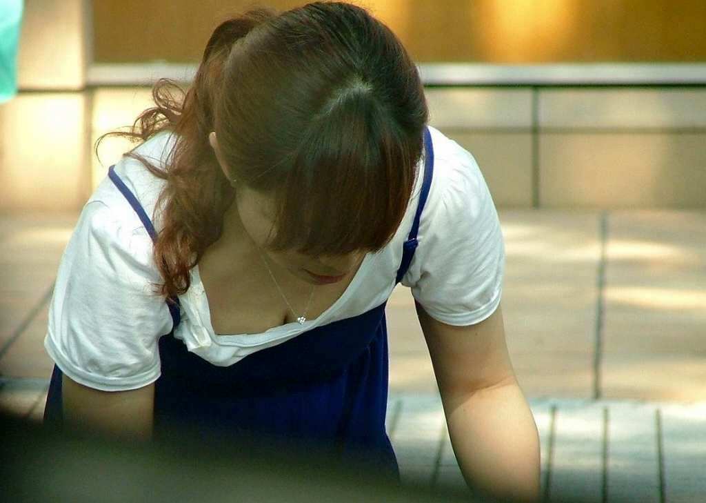 巨乳人妻さんの胸の谷間が丸見えで乳首も見えてるwww